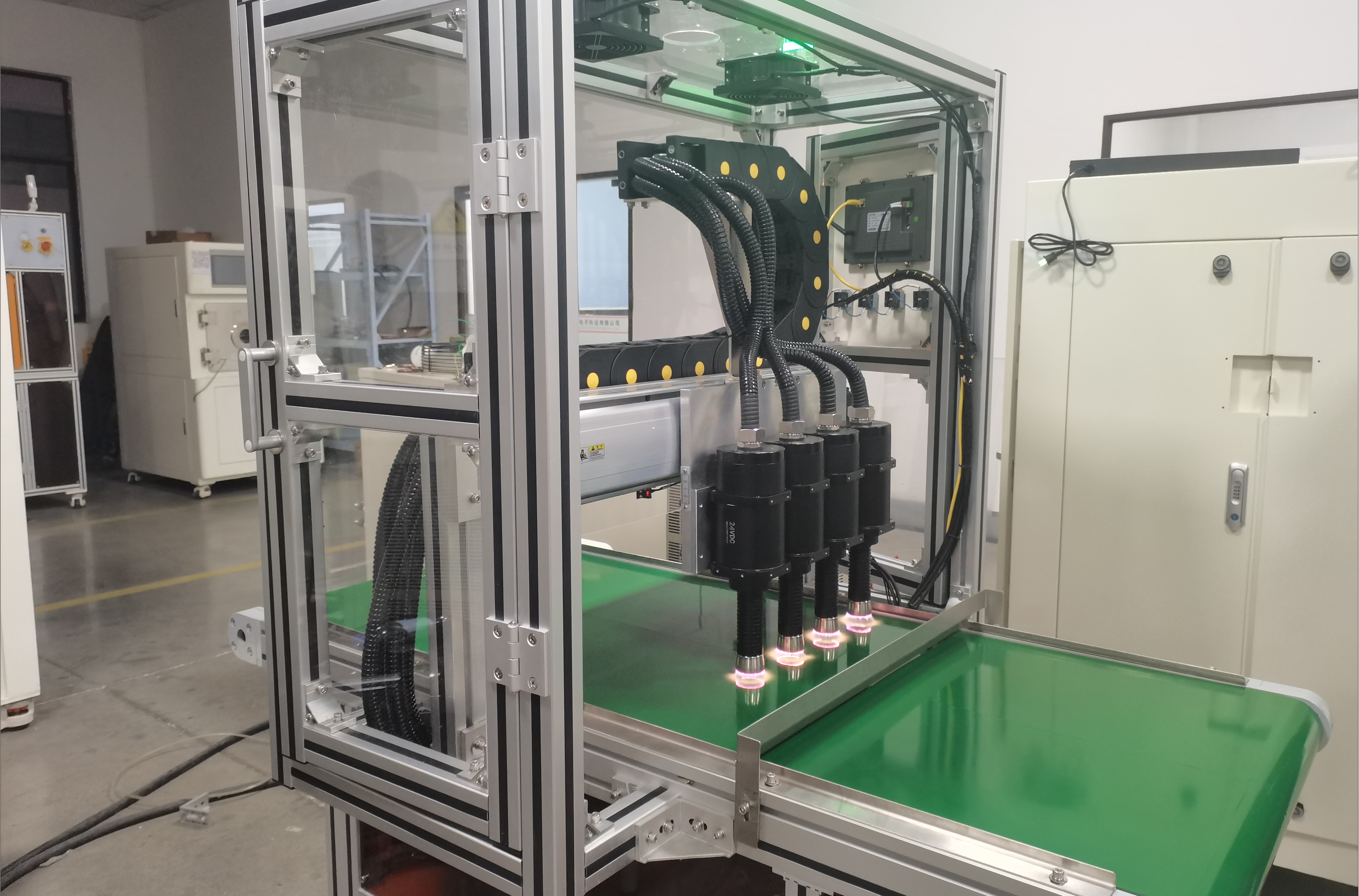 結(jié)構(gòu):采用常壓射流等離子噴頭,等離子體從噴頭噴出后直接作用于材料表面,無需真空腔體,可對接流水線。