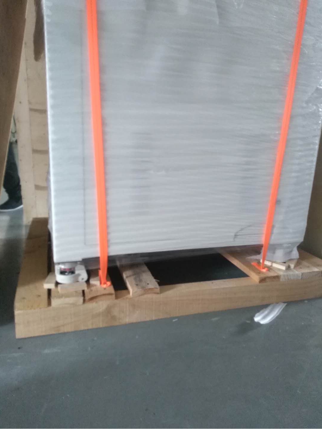 4 真空等離子清洗機(jī)打包時(shí),為了安全起見應(yīng)用吊車或叉車把設(shè)備放到木架上后,用木塊將腳輪鎖住,防止設(shè)備在運(yùn)輸過程中在包裝箱內(nèi)晃動(dòng),導(dǎo)致設(shè)備外觀破損。如圖4