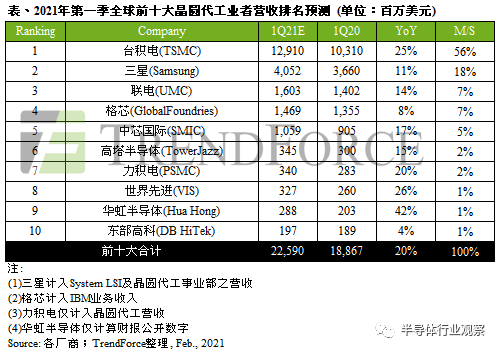 文章導(dǎo)讀:普樂(lè)斯恭喜今年第一季度,全球晶圓代工市場(chǎng)需求持續(xù)旺盛,各個(gè)應(yīng)用市場(chǎng)產(chǎn)品對(duì)芯片的需求居高不下,客戶普遍加大了拉貨力度,進(jìn)一步加劇了晶圓代工產(chǎn)能供不應(yīng)求的狀況。因此,集邦咨詢預(yù)測(cè),各大廠商運(yùn)營(yíng)表現(xiàn)將持續(xù)走強(qiáng),預(yù)估第一季度全球前十大晶圓代工廠商總營(yíng)收有望實(shí)現(xiàn)20%的同比增長(zhǎng)率,從而達(dá)到歷史新高。