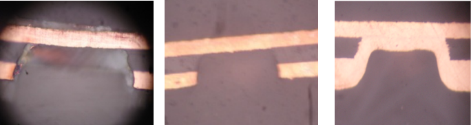 下圖分別為等離子清洗機處理前、處理后和線路板鍍銅后的截圖,由此可證明等離子清洗機可有效去除孔內(nèi)污染物且對襯板實現(xiàn)了定量咬蝕,明顯提升了鍍銅質(zhì)量。